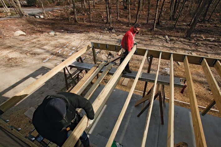 Joists must be positively attached to the ledger with joist hangers providing a minimum 1.5" bearing. Secure joists to beams with hurricane ties to resist uplift forces.